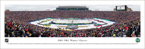 It was a breathtaking sight to see - the venerable Notre Dame campus, transformed for NHL hockey, with the stadium bleachers jam-packed and roaring with excitement - but with little green-and-gold to be found - instead, it was a sea of Blackhawks red and Bruins yellow! With the Chicago Blackhawks and Boston Bruins taking the ice in the world's biggest hockey arena, on a cold winter's day, it was a winter wonderland of pure NHL perfection, ending ultimately in a big-time Bruins victory. Printed in brilliant color and perfect focus on high-quality print stock, and complete with a sharp white border that includes the official Winter Classic logo, the commemorative title, and the above descriptive paragraph, this gameday panorama is both a beauty for the wall, and a great collector's item for years to come. Perfect for the wall of home, office, locker room or arena!