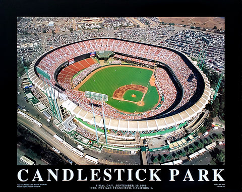 For most San Francisco baseball fans, there's no love lost for Candlestick Park. It was a little too big, a little too far out of the way, and a LOT too cold and windy on most summer nights! It was also replaced by one of baseball's finest stadiums, Pac Bell Park, which has already witnessed dozens of great moments in its first few years. Nonetheless, Candlestick was the home of the beloved San Francisco Giants for four decades of baseball, opened in the heart of the Say-Hey Willie Mays era, and closed in the heart of Barry Bonds dominance. This incredible poster, featuring Mike Smith's spectacular overhead photography, will bring back countless memories for long-time Giants fans, commemorating the long-anticipated end of baseball on the Point. Perfect for the wall of any fan!