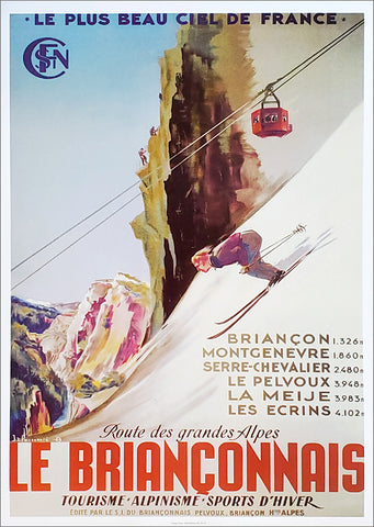 Celebrating the rugged beauty of the grandes Alpes! This 1947-vintage poster reproduction was originally published to promote travel to le Brianconnais, one of the premier skiing and climbing regions in France. It features J.P. Poissonnie's brilliant artwork of a speed demon racing downhill in the foreground, with climbers scaling a rocky peak behind. A true beauty, perfect for the wall of your home, office or ski chalet!