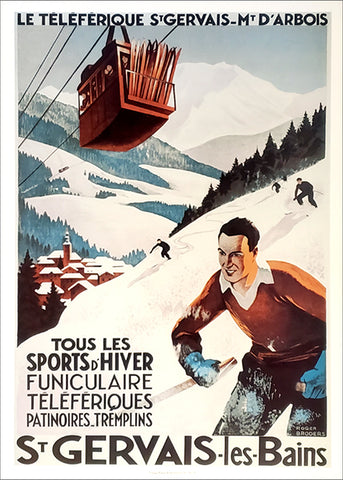 A beautiful classic look at one of France's most popular Alpine resorts! This amazing poster features a stunning ski scene high in the mountains around St. Gervais, in the North-West corner of the French Alps. Illustrated by legendary poster artist Roger Broders, this 1930-vintage travel poster includes great action and one of the region's first enclosed gondolas. Another tremendous reproduction, perfect for the wall of home, office, ski chalet, bar, restaurant or coffee shop!