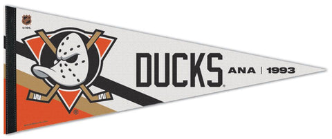 Amazing, rare Ducks style for your wall! From the brilliant NHL Reverse-Retro collection, this awesome pennant celebrates the Disney-inspired duck-billed goalie mask logo used on the team's earliest uniforms in the 1990s, set in the team's modern 2022 color scheme. Set in a perfect throwback design, with the simple "ANA 1993" text to commemorate the founding year of the franchise, this is a true beauty. Part of WinCraft Inc.'s premium pennant series, it features official team-themed graphics printed in full-color on a revolutionary soft-and-durable "Roll-it-and-Go" felt that can be tucked away, and look just as good when unrolled, ensuring a long-lasting pennant that will always look great! Sure to become a favorite item in your collection - the perfect accent to your sports wall-of-fame.