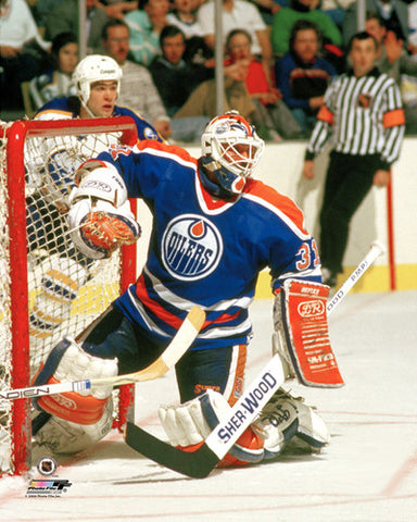 This historic archival image features Grant exactly as you want to remember him - battling his way back up and into the play after a mad defensive-zone scramble, oozing with confidence and intensity in his classic Oilers blue-and-orange. For fans of Fuhr and the great old-school Oilers, this is exactly as you want it - a huge reproduction for your wall, nothing but vintage Oilers action! Printed on high-quality photographic stock, and complete with official NHL Properties serialized holographic logo, this is a true classic for your wall. Published exclusively for SportsPosterWarehouse.com, this poster deserves a nice frame and a prominent place on your sports wall-of-fame!