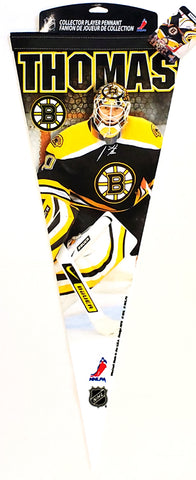 Own a rare and beautiful collector's item, featuring the All-Star Superstar goaltender of the Boston Bruins! This brilliant pennant, from Wincraft Inc.'s limited-edition Player Series, celebrates the amazing Tim Thomas in all his glory. With rare intense game-action photography, amazing graphics, and an attached card printed with a serial number /2,009 to give each pennant individualized collectability, this is both a beauty for your wall, and a valuable collector's item for years to come. Part of WinCraft's premium pennant line, the clear and brilliant photography and graphics are printed on a revolutionary soft-and-durable "Roll-it-and-Go" felt that can be tucked tightly away if necessary, and look just as good when unfurled again, ensuring your pennant will continue to look great and last a lifetime. The perfect accent to your sports wall-of-fame, and a rare item for any serious fan or collector! NOTE: LAST ONE LEFT IN STOCK.