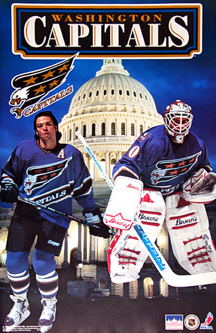 Bring your wall alive with classic Caps style! This amazing poster features two of the superstars of the ascending mid-1990s Washington Capitals squads - goaltender Olaf Kolzig and front-line center Joe Juneau - who took the team all the way to the Stanley Cup Finals in 1998. Set atop a brilliant night view of the US Capital Building, with the soaring-eagle Caps logo of the day, this one has it all. A rare classic from a thrilling era - a must-have addition to your wall and your collection! Note: this poster is now out-of-print; limited quantity remains in our warehouse.