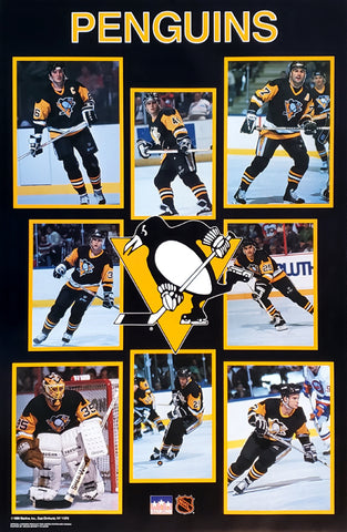 The Pittsburgh Penguins were a dominating force when they won consecutive Stanley Cup championships in 1991 and 1992. The nucleus of those teams was just taking shape in 1989, when this poster was published. A great collectors item for fans of the NHL's most dynamic team. Appearing, clockwise from top left: Mario Lemieux, Rob Brown, Paul Coffey, Kevin Stevens, John Cullen, Phil Bourque, Tom Barrasso, Zarley Zalapski. Limited quantity remains in our warehouse.