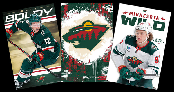 Item # WI-PP-2291COMBO: Minnesota Wild Hockey 3-Poster Combo Set (Kaprizov, Boldy, Team Logo) Official NHL Posters - Costacos
